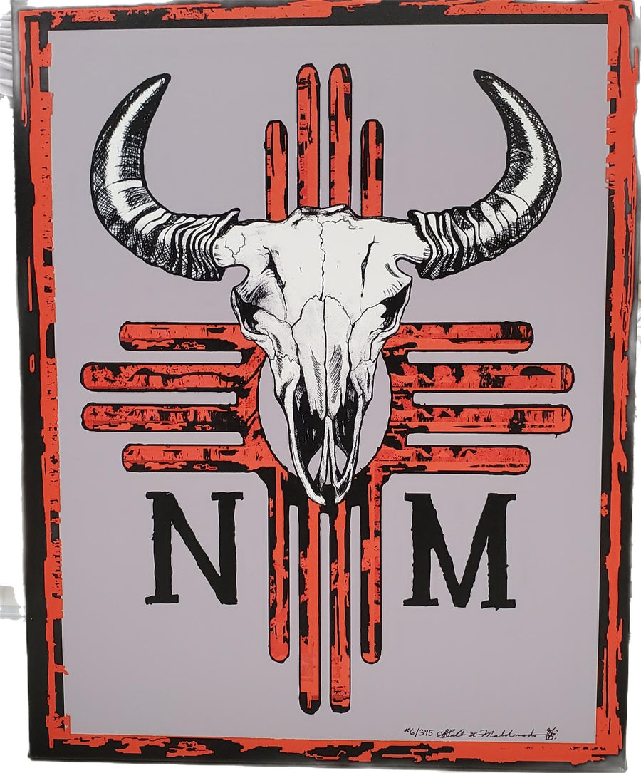 El color vivo de mis pinturas se ha inspirado en la vida en la encantadora ciudad de Santa Fe, Nuevo México; la luz fantástica, el encanto histórico y el estilo creativo único que ofrece no se parecen a ningún otro lugar del mundo. Mi aplicación de pintura a superficies de hojalata trabajadas a mano, que también se convierten en los marcos exteriores de las pinturas, cada una creada por mi esposo John Maldonado, expresa mi conexión con la cultura de Nuevo México; una cultura que honra la tradición y al mismo tiempo abraza lo nuevo. Mi segunda influencia principal proviene de mis viajes por Sudamérica y nuestro vecino México, donde he estado expuesto al 'Día de los Muertos', una celebración que honra la vida en todas sus etapas. Cada peregrinación a través de estos escenarios de vida coloridos pero más simples me bendice con un avance de mi visión artística: un descubrimiento del esqueleto: quiénes somos realmente debajo de todo.
